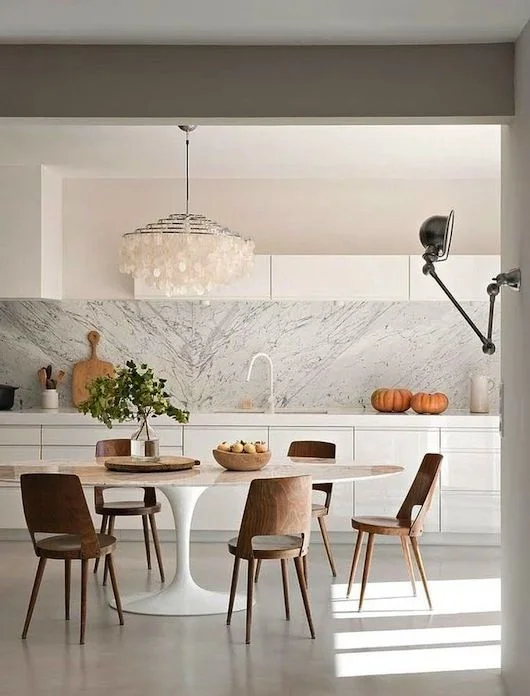 Traditional kitchens work well with stone, black, or white kitchen splashbacks.